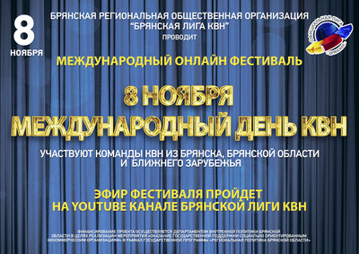 БРОО "Брянская лига КВН" предлогает Вам поучавствовать в нашем Международном фестивале! Ты можешь стать как участником так и простым зрителем! Собирай свою команду, работай с редакторами, записывай свое видео и присылай нам! Эфир фестиваля состоится на youtube Канале Брянской лиги КВН 8 ноября! Подробности в положении фестиваля.