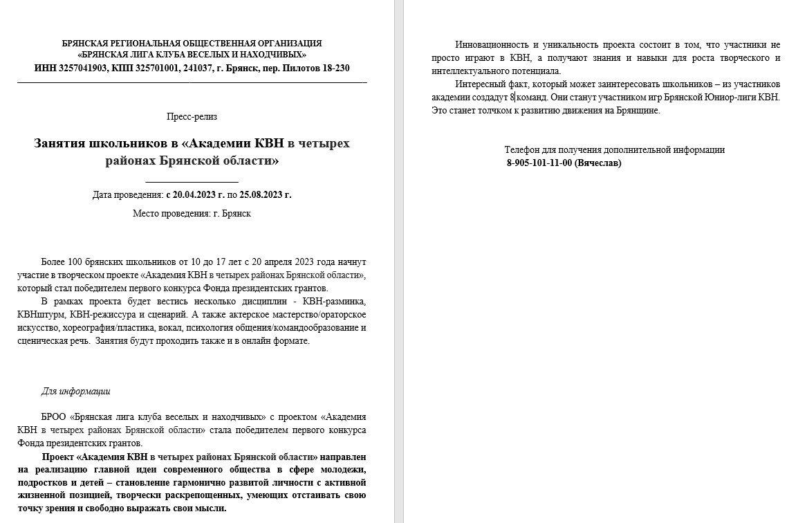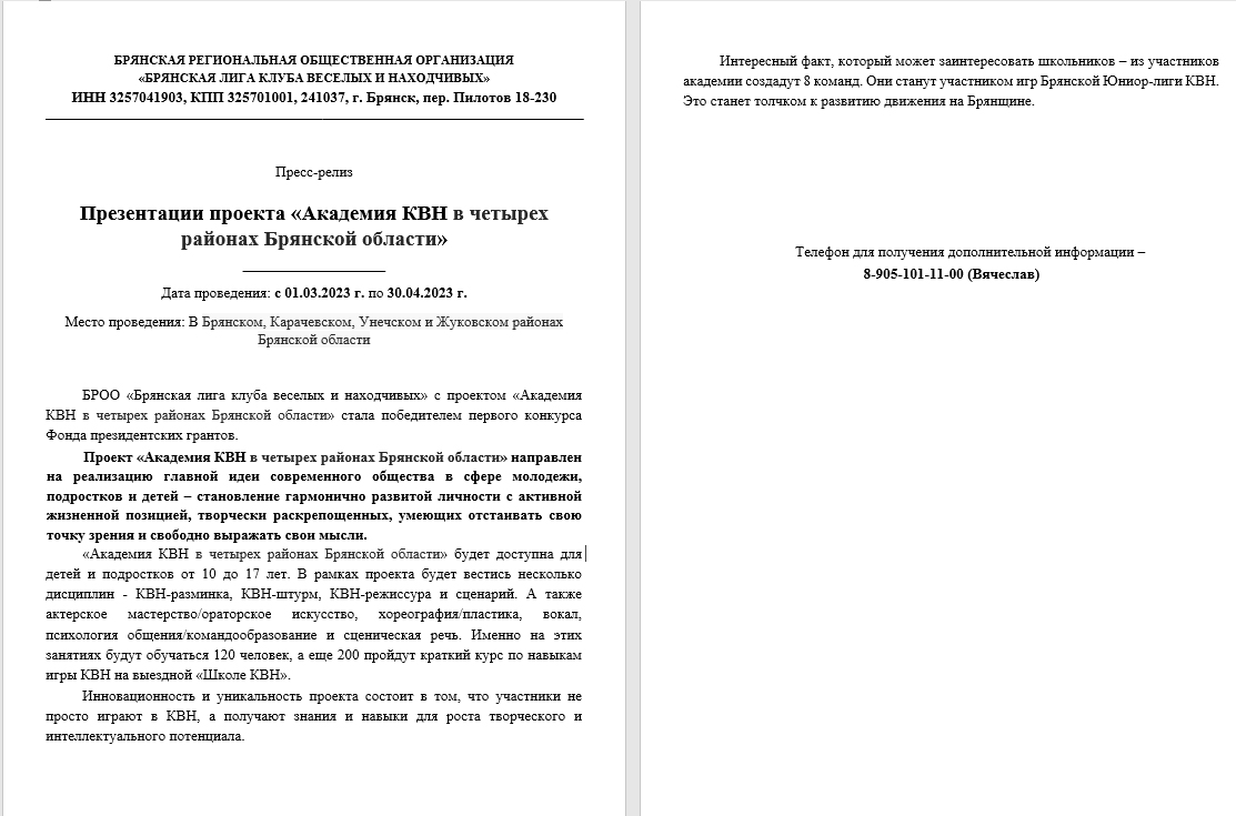 15:40 Пресс-релизы проекта "Академия КВН в четырех районах Брянской области" | |